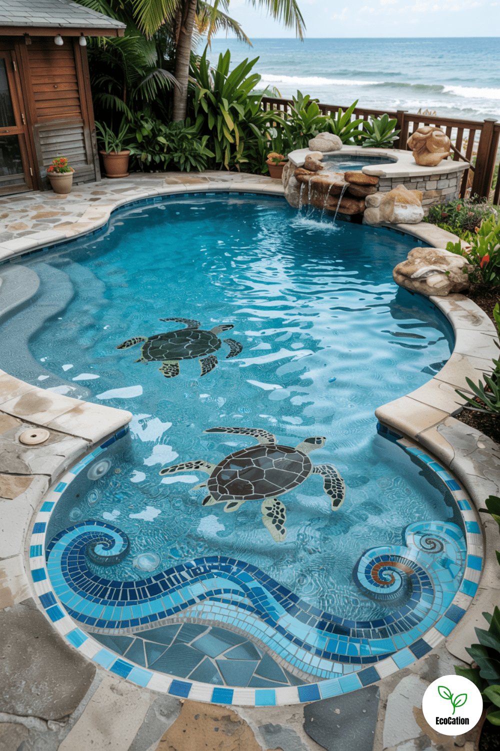 Custom mosaic tiles depicting sea turtles, waves, or abstract designs turn the pool floor into artwork. Frame it with colorful border tiles for a cohesive look. This personalized touch makes your pool truly one-of-a-kind.