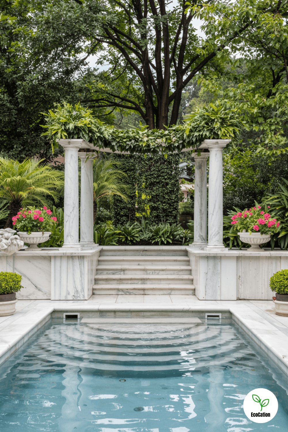 Wide Roman steps, marble columns, and a formal garden backdrop bring timeless sophistication. The grand entrance makes every swim feel luxurious. For an authentic touch, use light-colored stone to keep the pool cool under the sun.