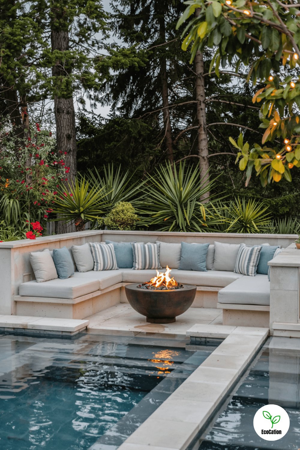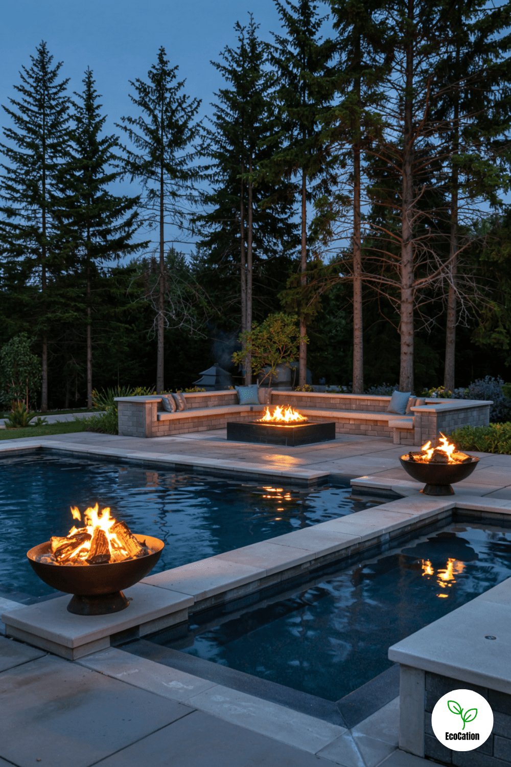 Fire bowls at each corner and a sunken fire pit lounge create a striking contrast with the cool pool. The flickering flames reflect on the water for a mesmerizing effect. Use smooth stones around the fire features for a polished look.