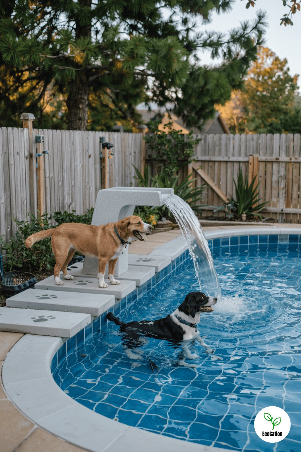 A shallow entry ramp, paw-print tiles, and gentle jets make this pool safe for pets. The textured ramp helps dogs enter and exit easily, while the playful design adds charm. Just be sure to rinse off furry friends afterward to keep the water clean!