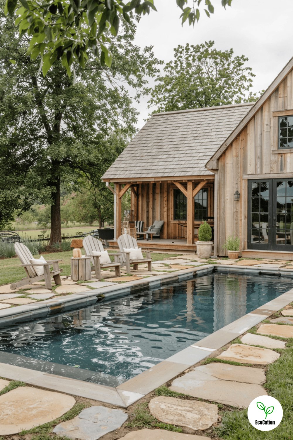 A weathered flagstone pool surround and wooden lounge chairs give this in-ground pool a charming farmhouse feel. The rugged stone contrasts beautifully with the water s shimmer. Add a vintage-style outdoor rug and galvanized metal planters for extra rustic appeal. This design works perfectly beside a country-style home.