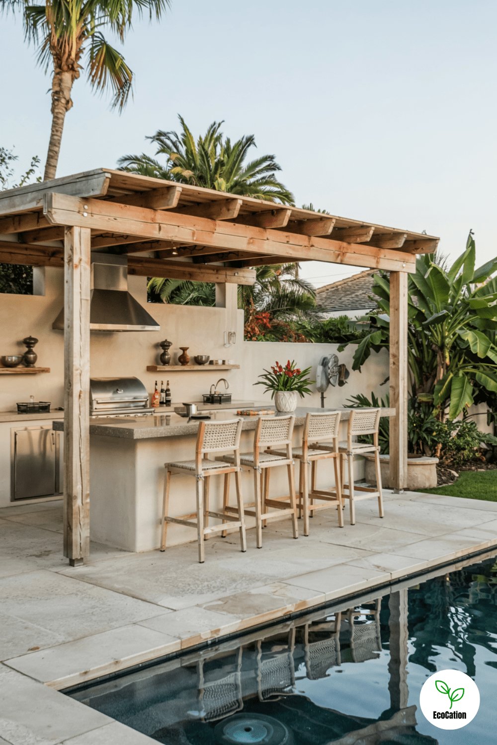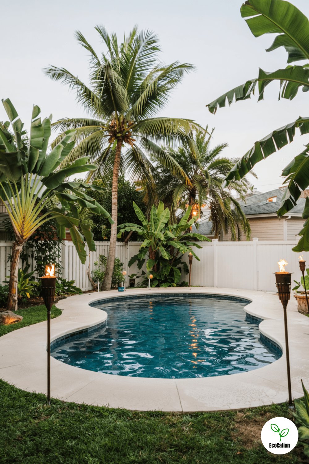Transform your backyard into a resort with palm trees, banana plants, and tiki torches encircling your pool. The lush greenery and flickering torches create an island vibe. For an authentic touch, use natural stone decking and add a thatched umbrella for shade. Bonus tip: Plant wind-resistant palms to keep your oasis intact during breezy days.