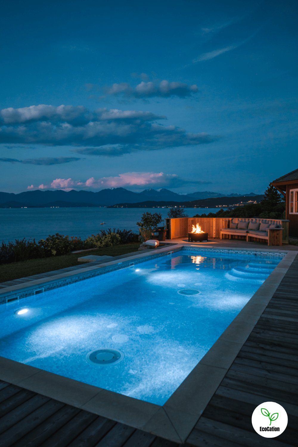 Underwater LED lighting in vibrant blues and purples turns this pool into a glowing masterpiece at night. A wooden deck and fire pit seating complete the vibe. Choose color-changing LEDs for customizable moods, and arrange seating around the fire pit for cozy gatherings.