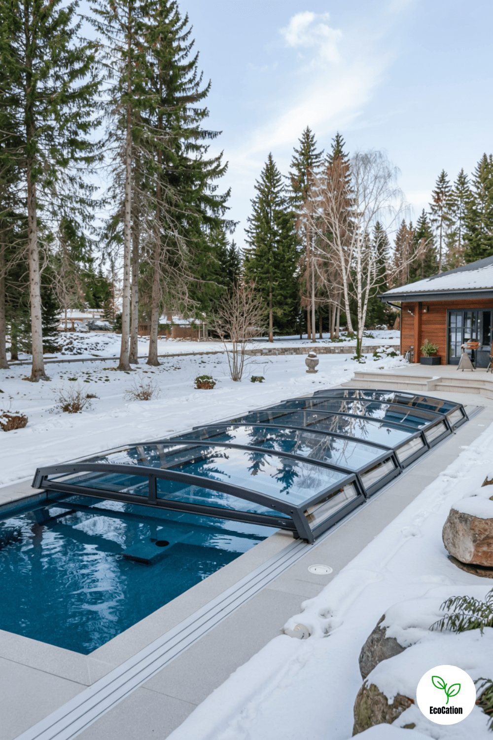 A retractable glass cover allows year-round swimming, even in snowy climates. The enclosure keeps heat in and debris out, making maintenance easier. Modern designs can be automated for effortless opening and closing.