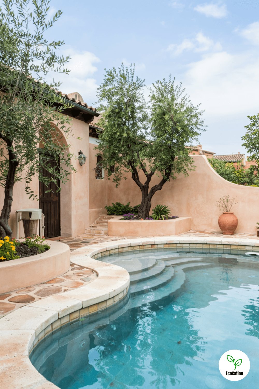 Curved edges, a terracotta deck, and swaying olive trees bring Mediterranean charm. Add wrought iron furniture and ceramic pots for an authentic coastal feel. The warm tones make the water appear even more inviting.