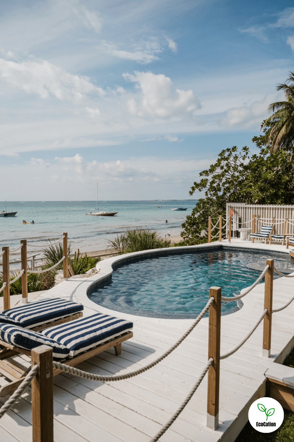 Rope railings, navy-striped loungers, and a deck shaped like a boat hull create a beachy vibe. Add porthole-style windows or a ship s wheel decor for extra maritime charm. Perfect for coastal homes or anyone who loves the sea.