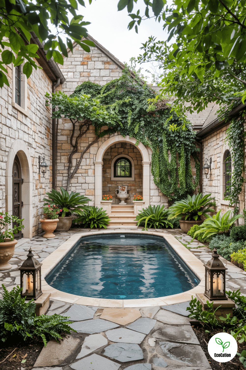 High stone walls, climbing ivy, and wrought iron lanterns create a hidden retreat. The enclosed space feels intimate and exclusive. Add a small bistro set for poolside dining, and use warm lighting to enhance the cozy vibe.