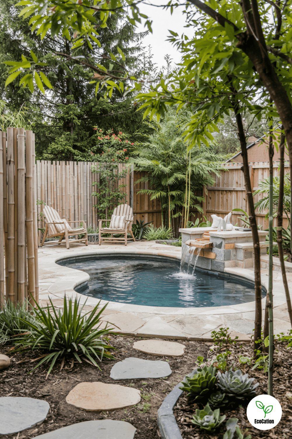 Create a peaceful escape with an in-ground pool surrounded by bamboo fencing, natural stone paths, and soft landscape lighting. The organic textures and gentle illumination make evenings by the water feel magical. For extra privacy, add tall bamboo clusters, and opt for solar-powered lights to keep energy costs low. This design is perfect for unwinding after a long day.