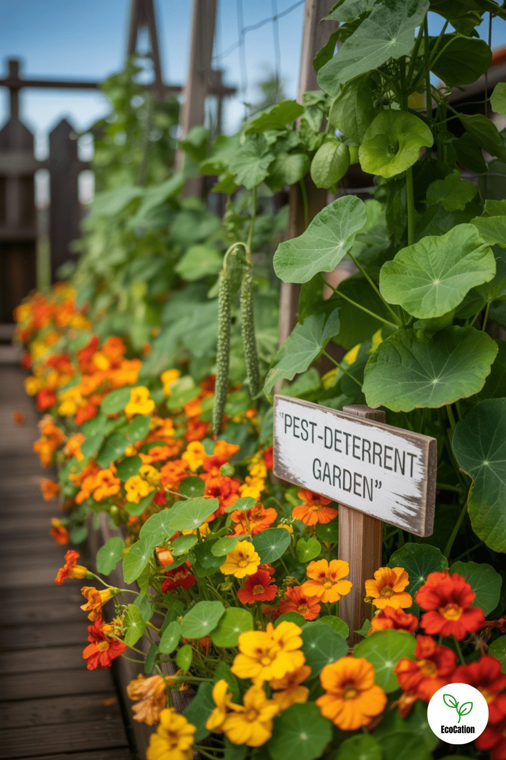 Bright nasturtiums and marigolds ring this garden, luring pests away from your precious greens. Trap crops are a colorful, organic way to reduce damage and boost survival garden yields. Beauty and function, all in one.
