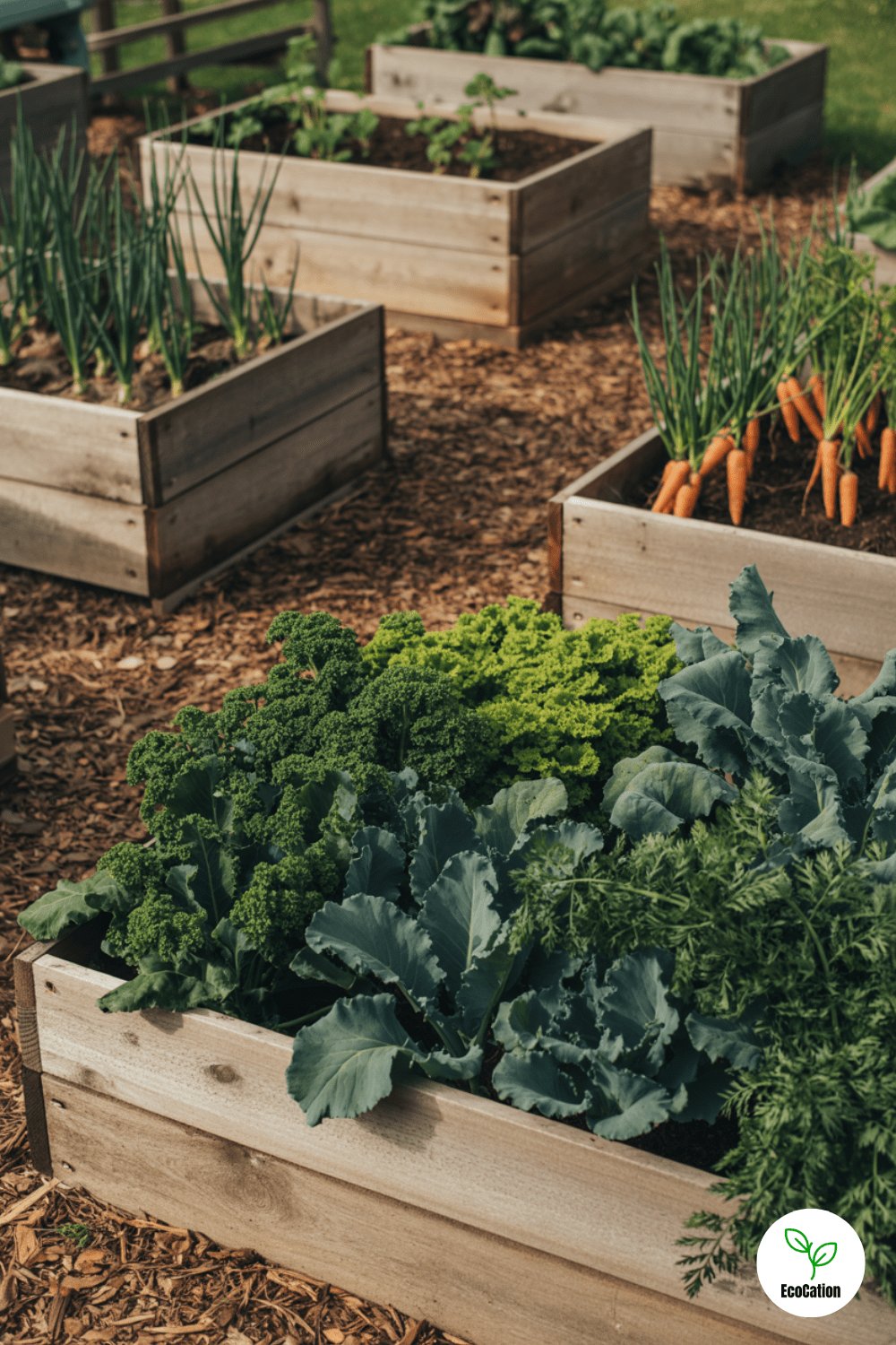 Carrots, onions, and kale grow in neat wooden beds surrounded by thick mulch paths. Mulch suppresses weeds and keeps soil moist, while the structured layout makes maintenance easy. This design is a win for self sufficient living with less sweat.