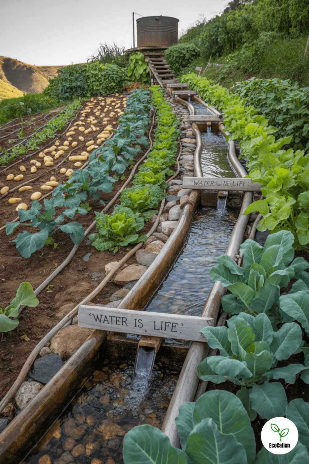 Sloped land? Turn it into an asset with a gravity-fed irrigation system. Rainwater flows downhill into rows of greens and tubers, no electricity required. This off grid homestead feature is practical, simple, and surprisingly productive.