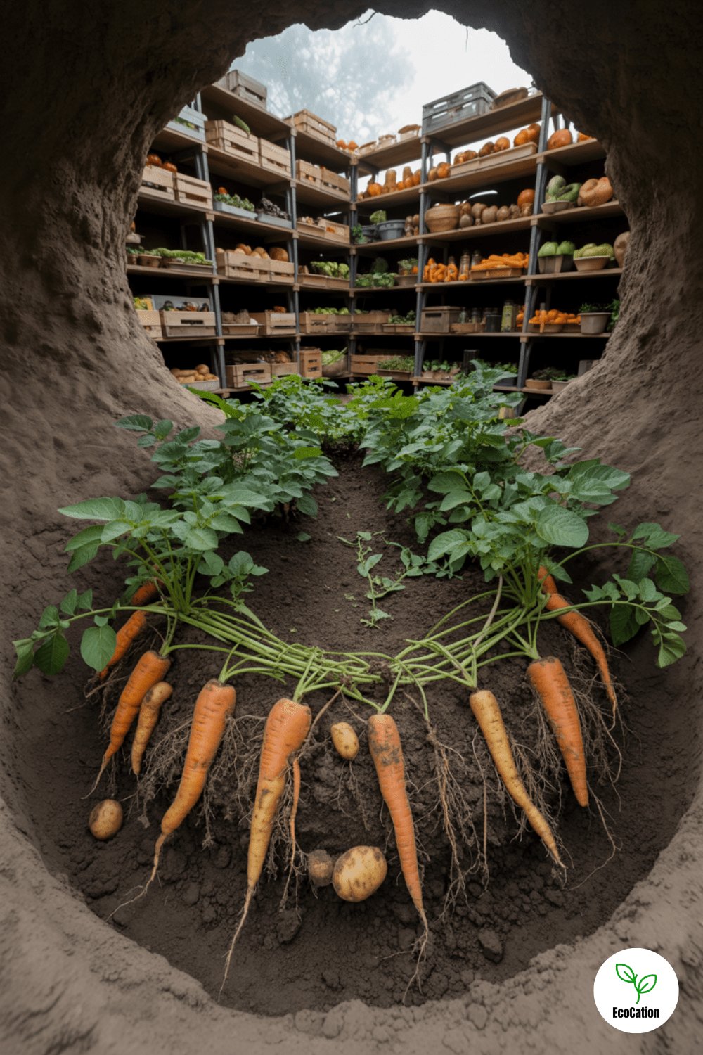 Half underground, half open-air, this potato and carrot pit garden also stores what it grows. The earth insulates, keeping crops fresh and protected. It s clever, practical, and pure underground garden genius.