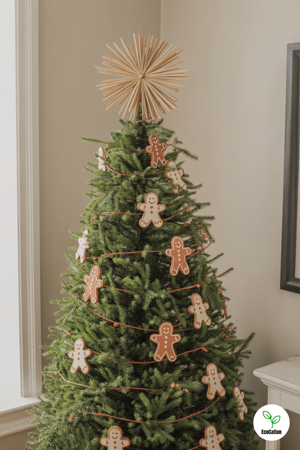Decorate a lovely, slender tree with simple red string lights and whimsical gingerbread men ornaments. A classic star made of straw completes this charming, nostalgic look. It is a delightful and easy way to bring a touch of childlike wonder to your home without needing a huge tree.