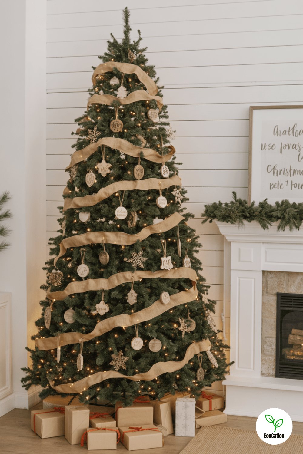 Imagine your tree standing proudly by the fireplace, adorned with twinkling lights and those charming handmade wooden ornaments you love. Burlap ribbons woven through the branches add a touch of rustic elegance, creating a cozy and nostalgic feel that truly warms the heart. For a perfect look, layer the burlap ribbon vertically before adding the ornaments.