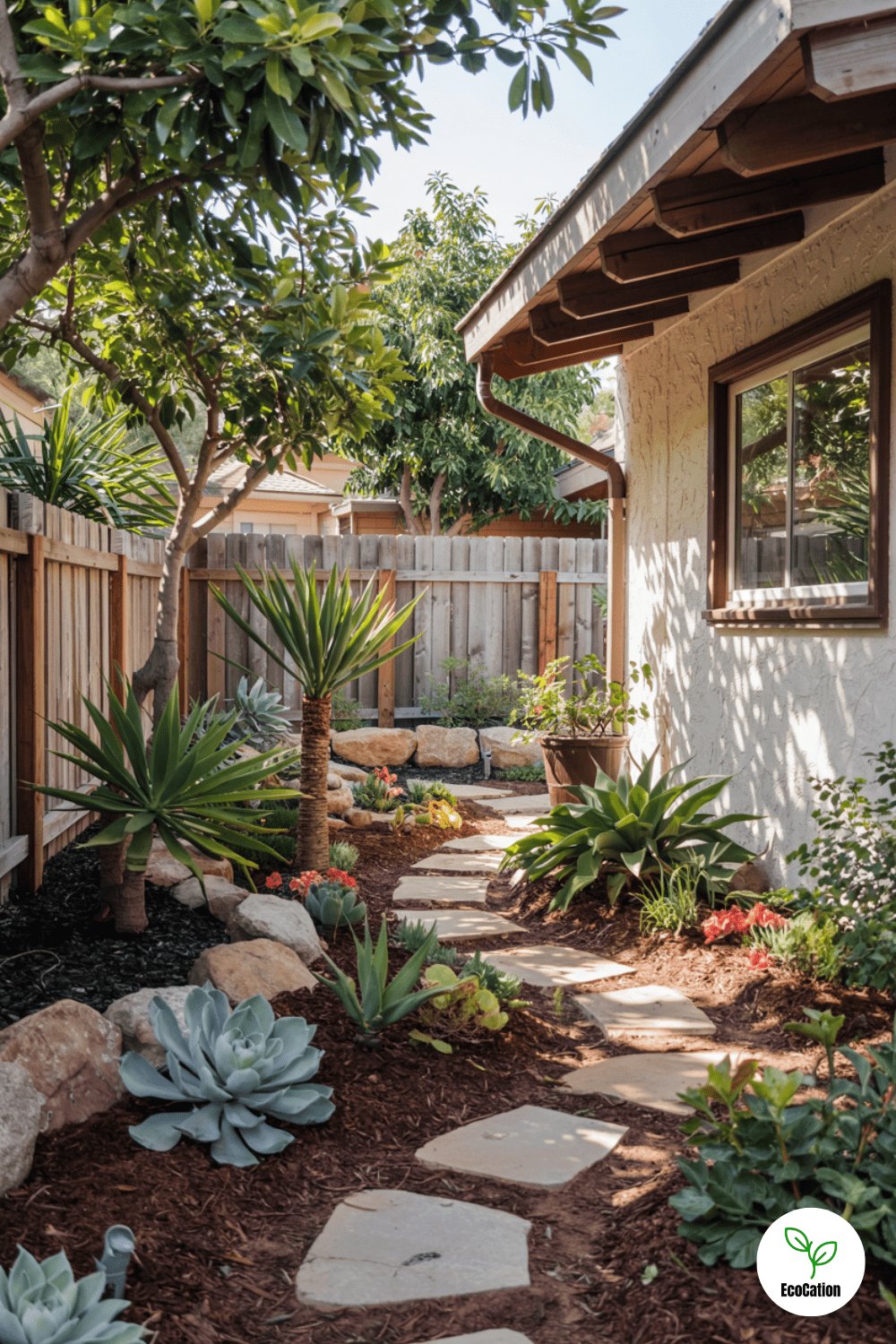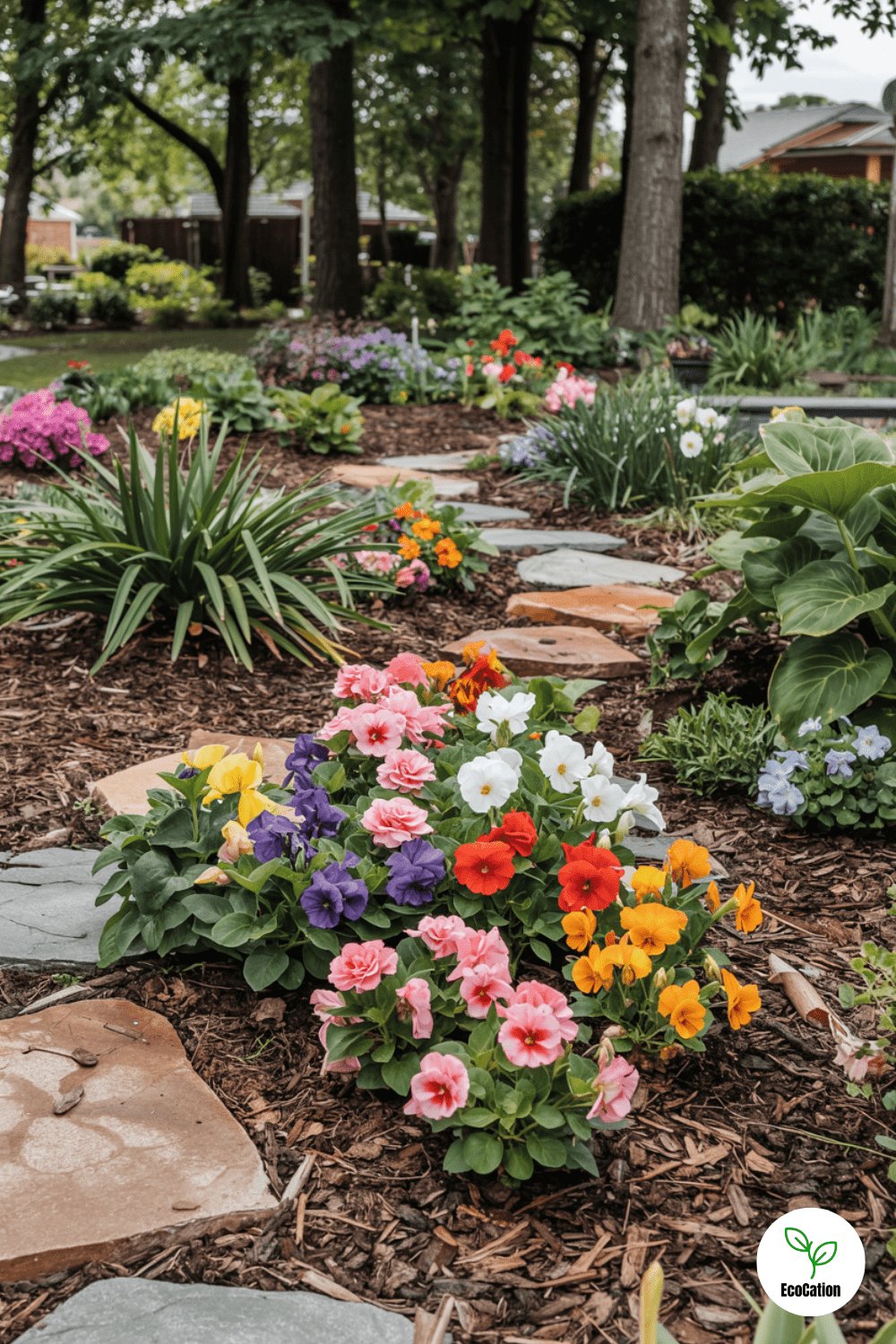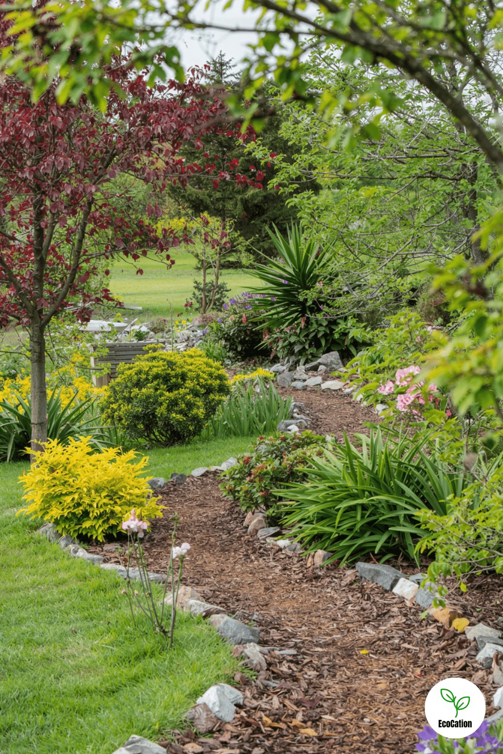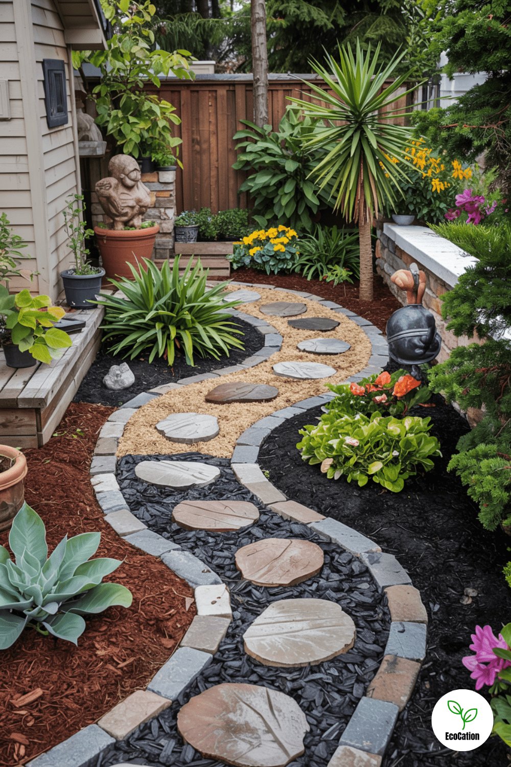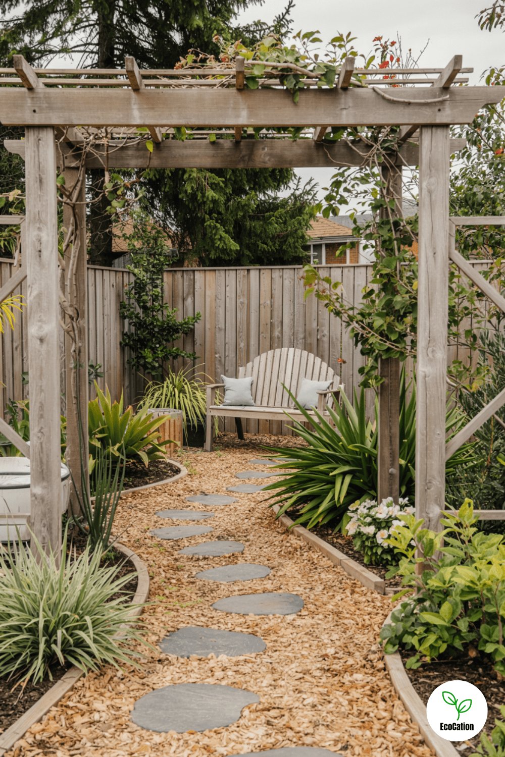 Stepping stones nestled in golden mulch create a welcoming trail. The warm tones lead visitors to a charming bench or pergola. Use landscape fabric beneath to prevent weeds between stones.