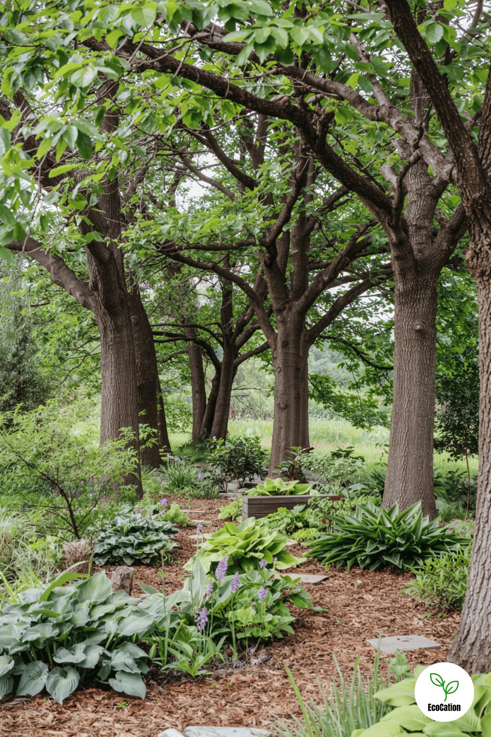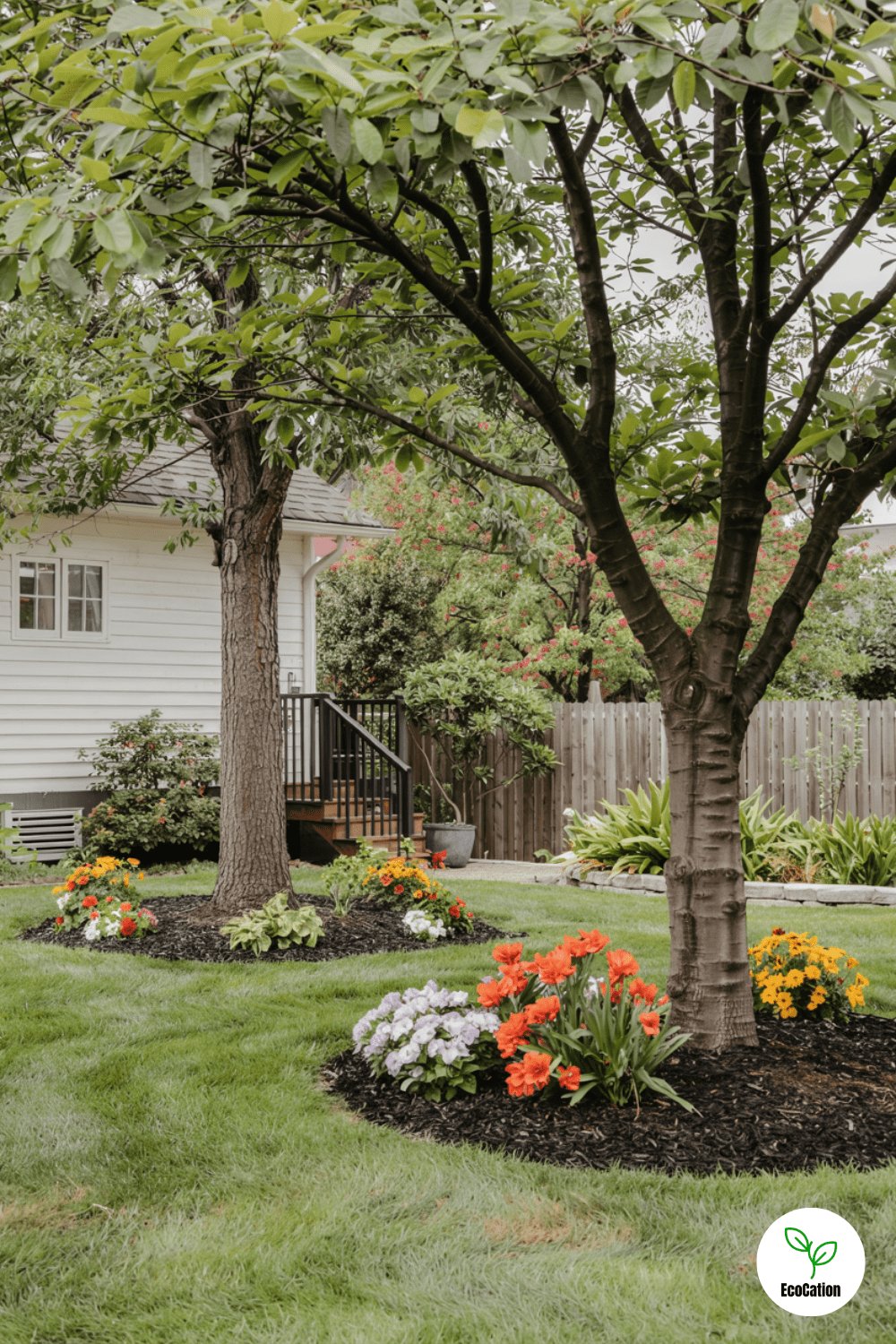 Circular mulch rings protect tree roots while adding visual interest. Plant seasonal flowers around the edges for year-round color. Leave space near the trunk to prevent moisture buildup and rot.