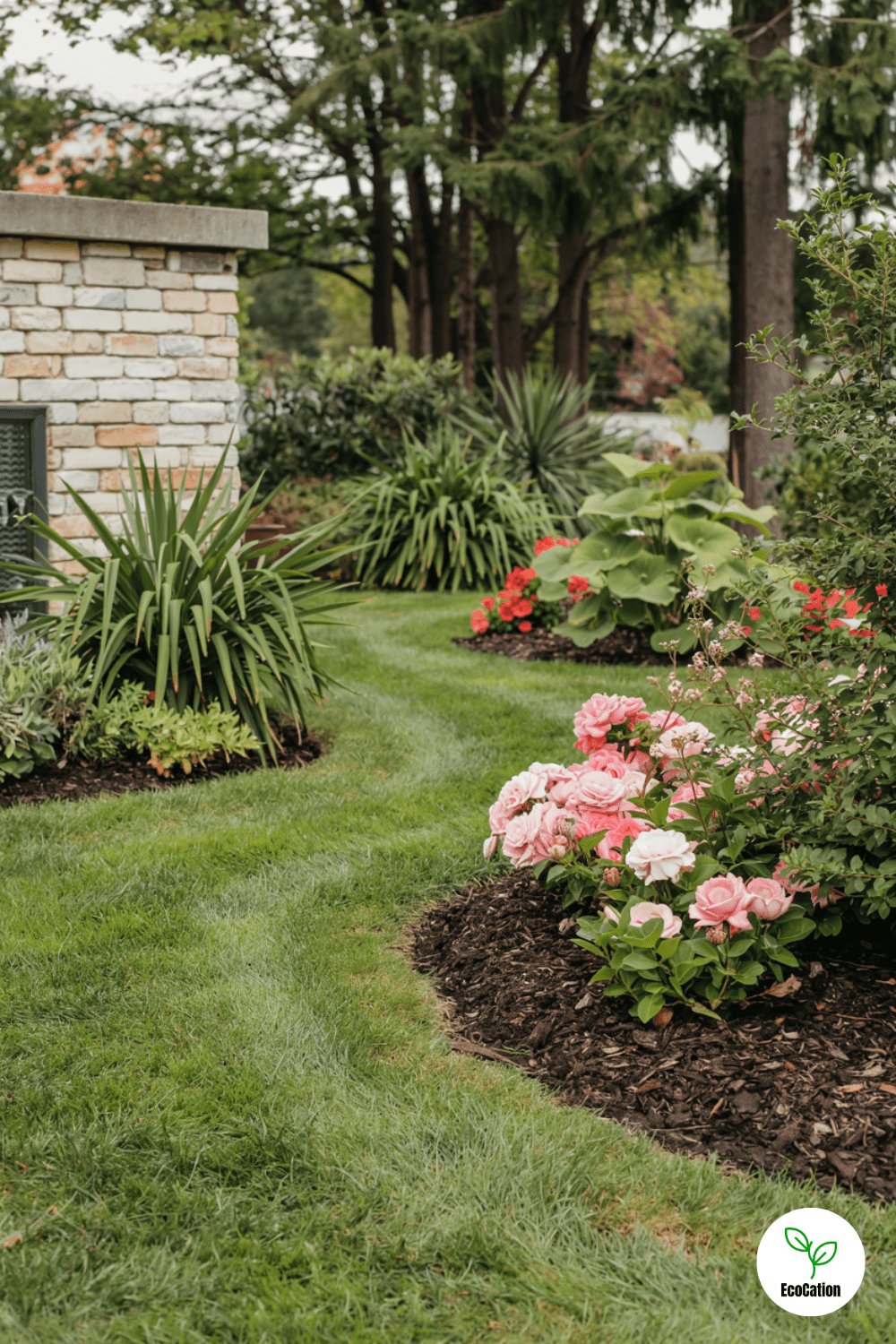Define your lawn with mulch-edged flower beds. The clean separation between lush grass and colorful blooms looks professionally manicured. Maintain sharp edges by trimming grass regularly and refreshing mulch annually.