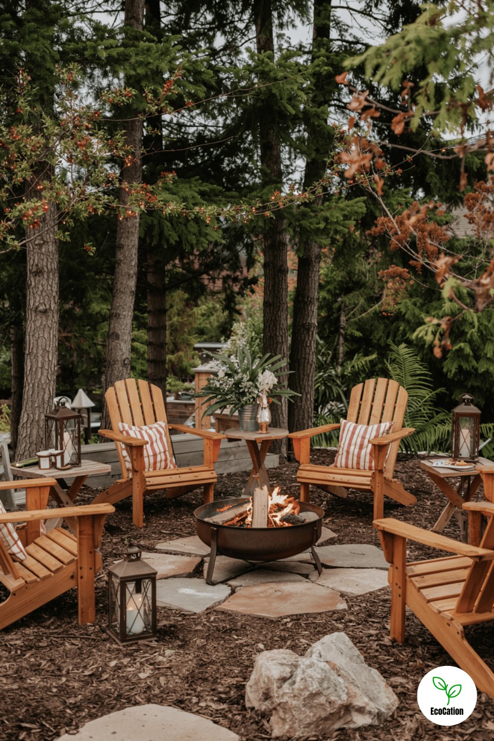 Dark brown mulch creates a clean base around a stone fire pit. The neutral backdrop makes seating areas pop while preventing muddy feet. Add weather-resistant lanterns for evening ambiance.