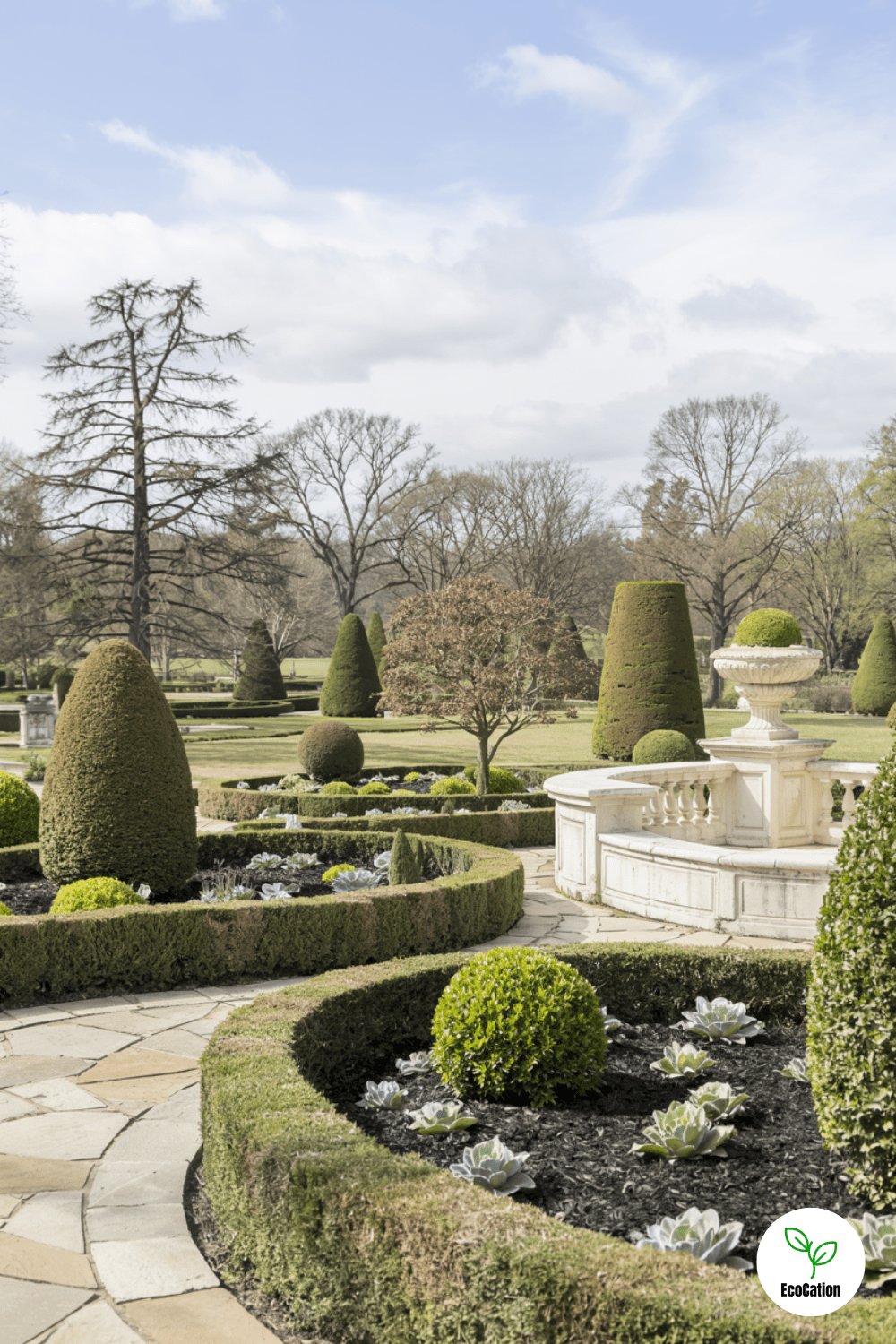 Black mulch frames formal topiaries and hedges elegantly. The dark background makes sculpted greenery stand out. Pair with stone walkways for a luxurious, high-end look.
