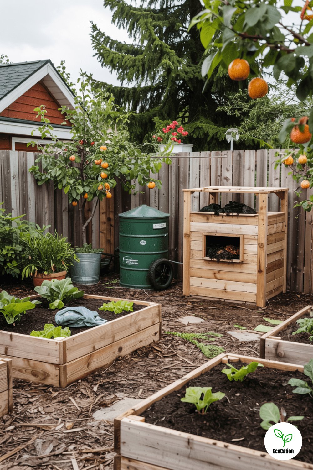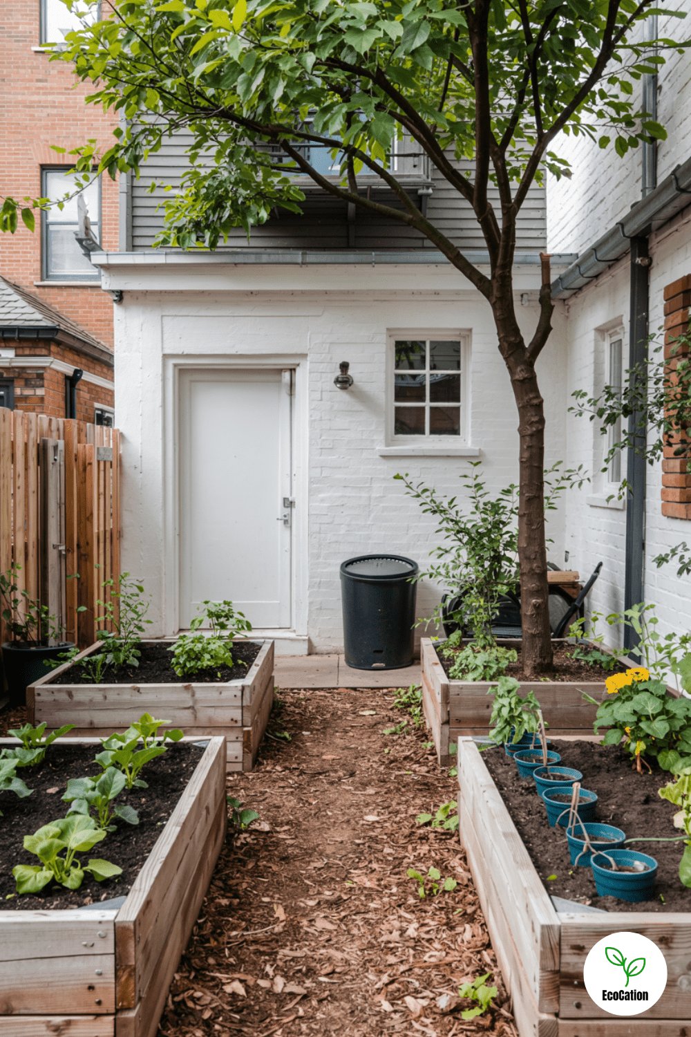 Use organic mulch around raised vegetable beds and fruit bushes. It suppresses weeds while enriching soil as it decomposes. Add a composting station nearby to create your own nutrient-rich mulch over time.