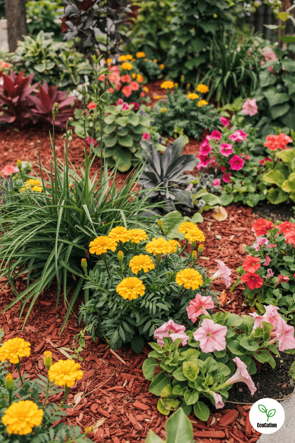 Bright red mulch creates dramatic contrast with yellow marigolds and pink petunias. The bold combination makes flower beds pop against deep green foliage. Replenish colored mulch annually to maintain its vibrancy.