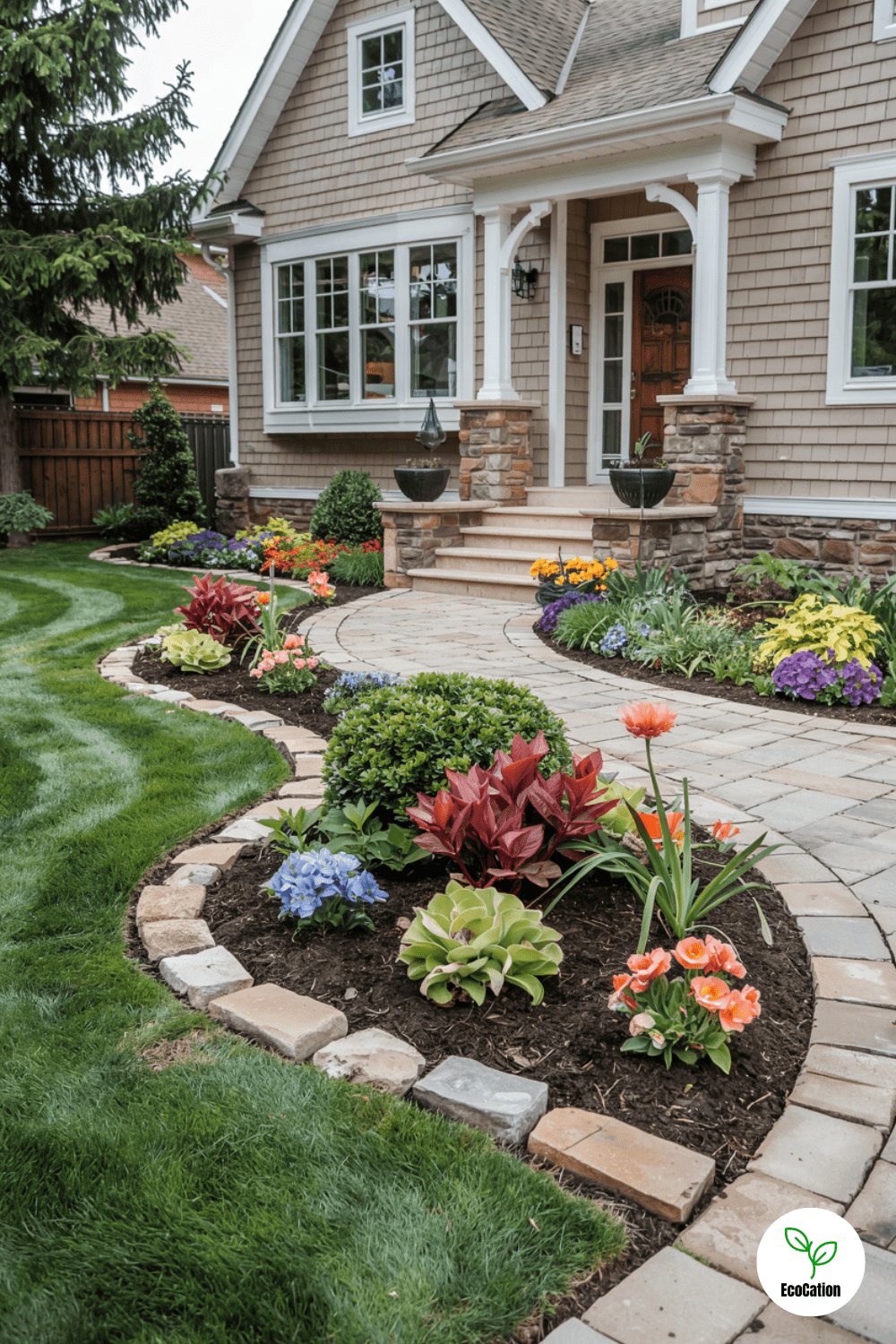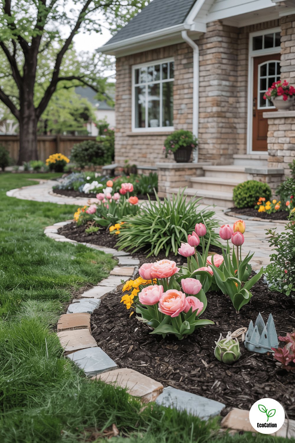 A curved flower bed filled with rich brown mulch adds softness to your front yard. Pair it with vibrant perennials and decorative stone edging for a polished look. The mulch suppresses weeds while improving soil health. Pro tip: Use a garden hose to outline smooth curves before digging for perfect, flowing lines.