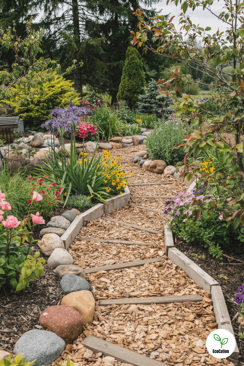 Wood chip mulch creates charming garden paths. Frame it with neatly arranged stones and flowering shrubs for a countryside feel. The soft texture is gentle underfoot while allowing rainwater to permeate the soil.