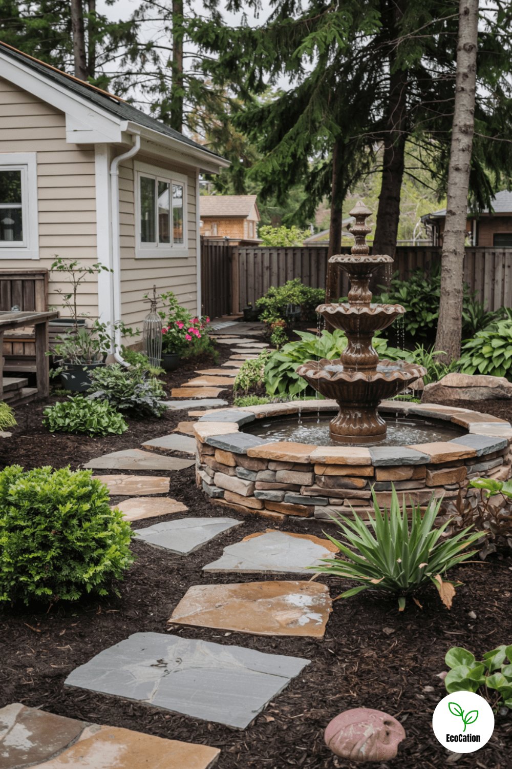 Dark brown mulch complements stacked stone walls and water features. The natural pairing creates timeless elegance. Use larger mulch chunks near fountains to prevent splashing from displacing the material.