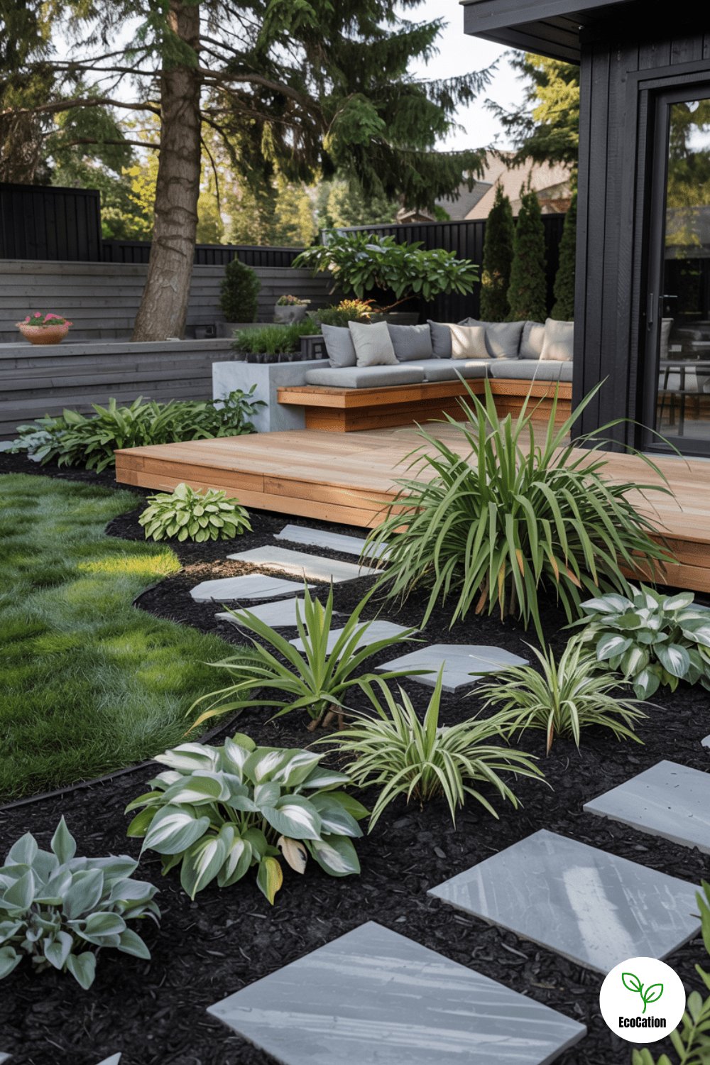 Black mulch offers a sleek, modern touch. Use it to highlight ornamental grasses and hostas near a wooden deck for striking contrast. Dark mulch also absorbs heat, warming soil in early spring for faster plant growth.