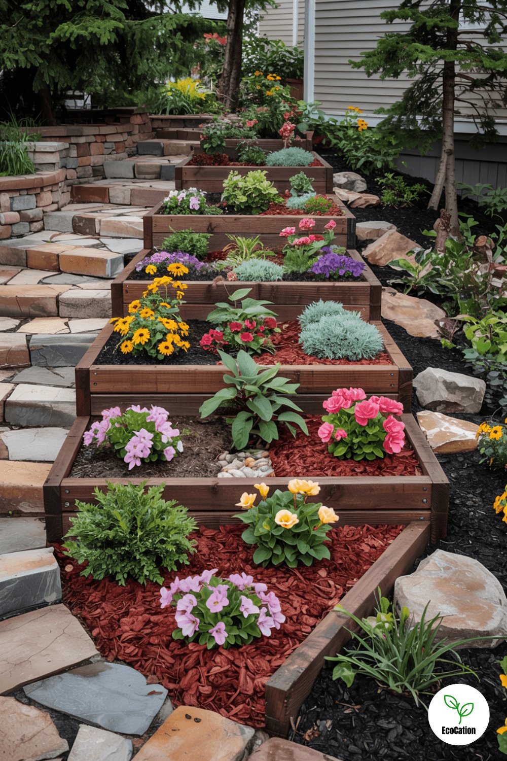 Red mulch in raised wooden beds adds depth to sloping landscapes. The vibrant color makes cascading flowers and shrubs stand out. Use untreated lumber to prevent chemical leaching into your soil.