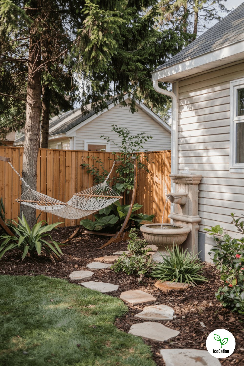 Deep brown mulch defines a private garden nook. The earthy tones create serenity around a hammock or water feature. Add shade-loving plants like hostas for lush greenery.