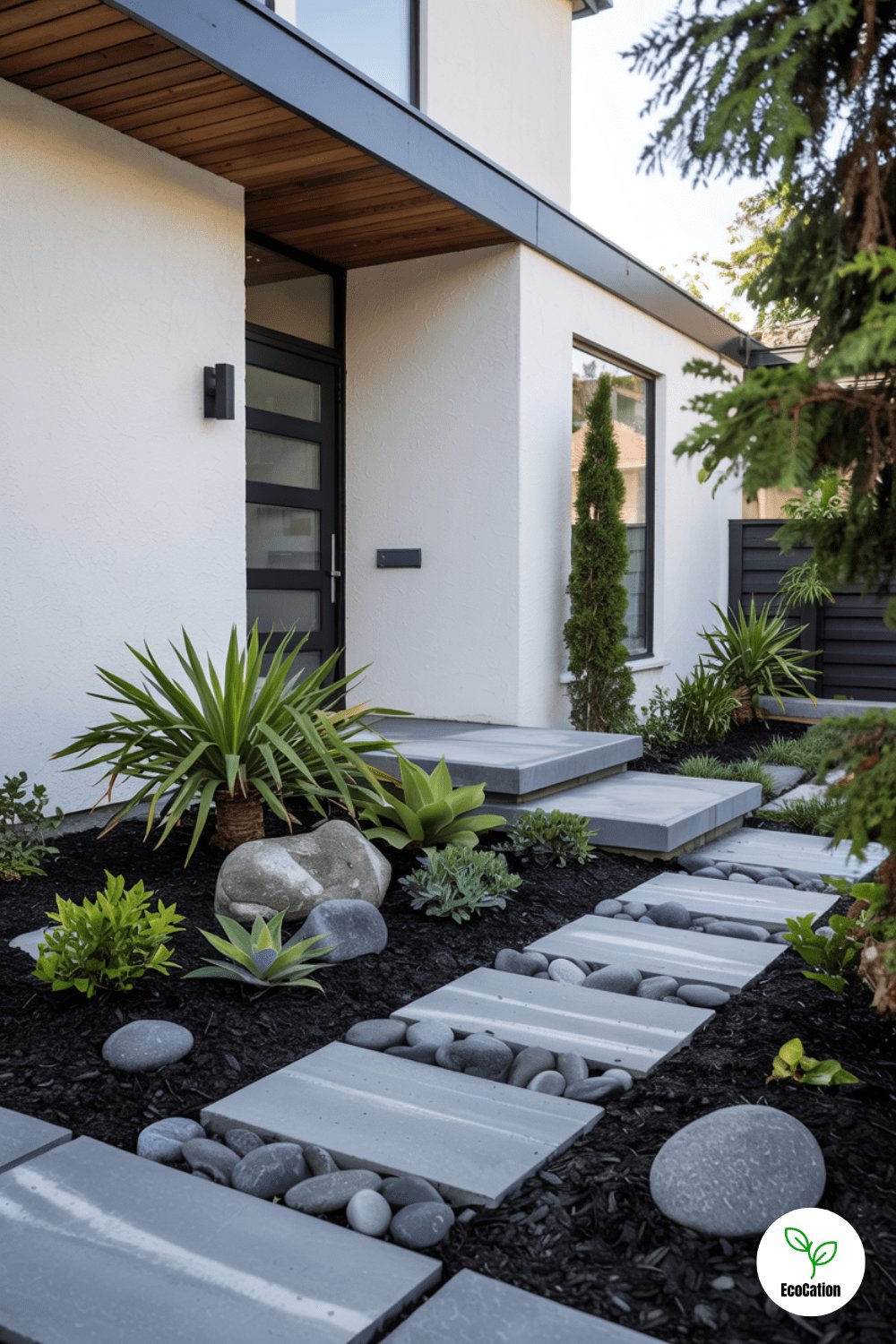 Black mulch paired with smooth river rocks creates contemporary flair. Arrange in geometric patterns around structural plants like ornamental grasses for urban sophistication.