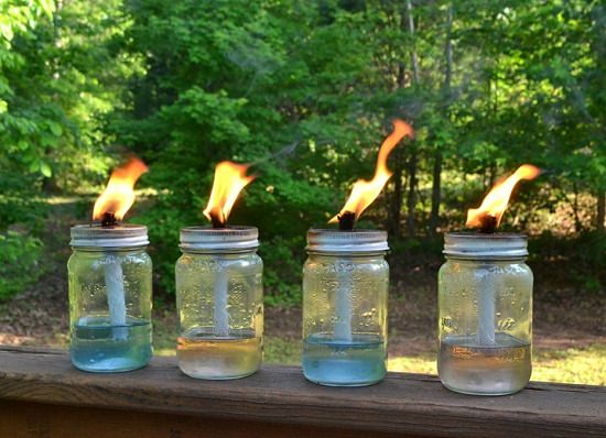 Drill a hole into the lid of a mason jar to let pass a tiki torch wick through it. Once the cord is positioned correctly, fill your mason jar with tiki fuel and put the lid on. Get the details here.