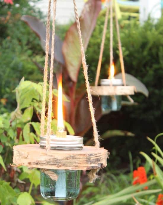 Hang a series of such tiki torches in your yard using wood slices, drill, mason jar, tiki fuel, twine, and wick. The idea is available here.