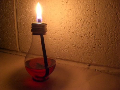 Fill an old bottle halfway with tiki fuel and insert the cotton string through a hole in the cap. We found the idea here.