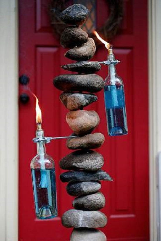Drill holes in each stone and slide down the rebar to imitate the tiki torch stand above. Once you create the stand, it s nothing complicated to DIY wine bottle tiki torches. Follow here.
