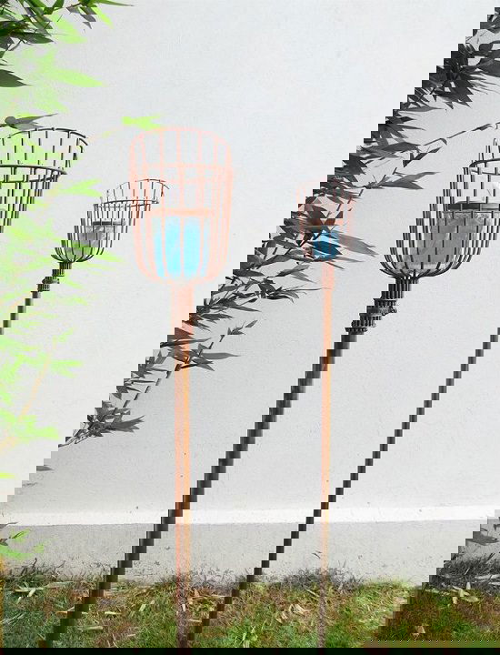 A vintage themed metal stand looks elegant when paired with two rustic looking containers loaded with citronella oil. Perfect for adding some light to the yard or garden.