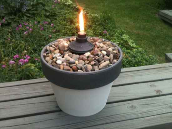 Fill a planter pot with gravel and stones and put a tiki canister in the middle to light up the surrounding in the dark.