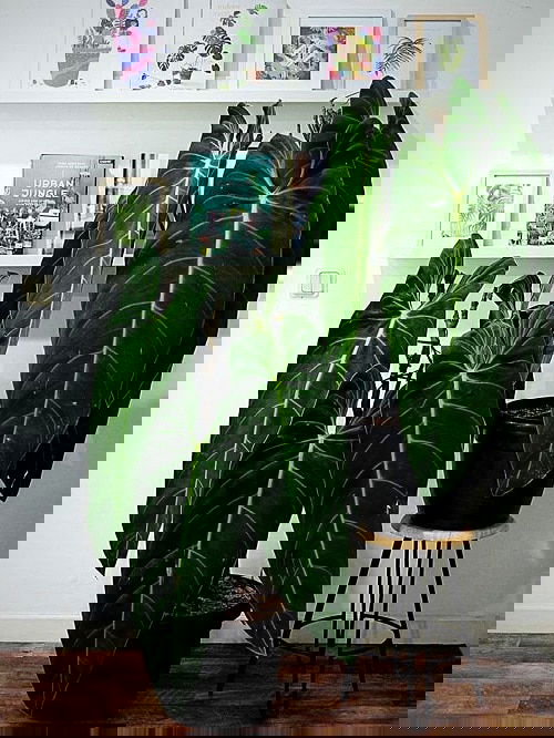 This tropical variety has dark green, almost black crystalline foliage with bright light green to yellow veins. The word Melanochrysum implies Black Gold.