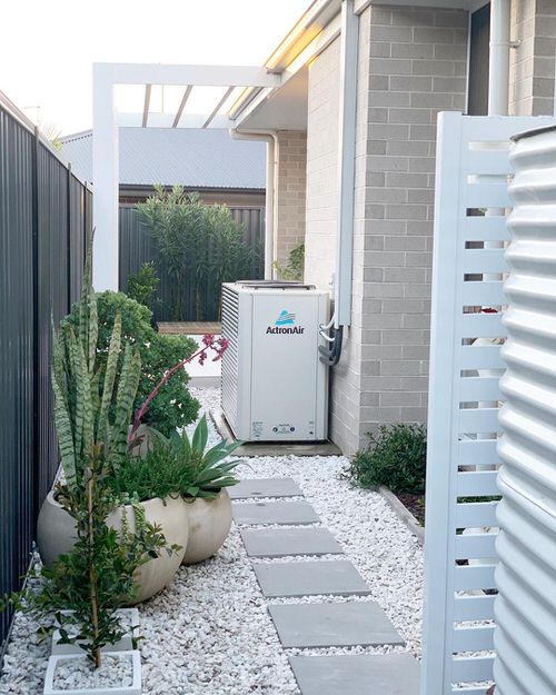2. Side Yard Landscaping with Pebbles and Potted Plants