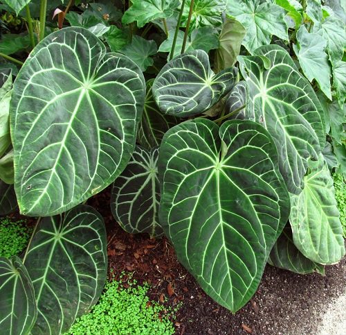 The large foliage of this plant measures up to 10-14 inches in length. Its leaves have a velvety feel to them, and the deep veins make them look spectacular! See more anthurium varieties .