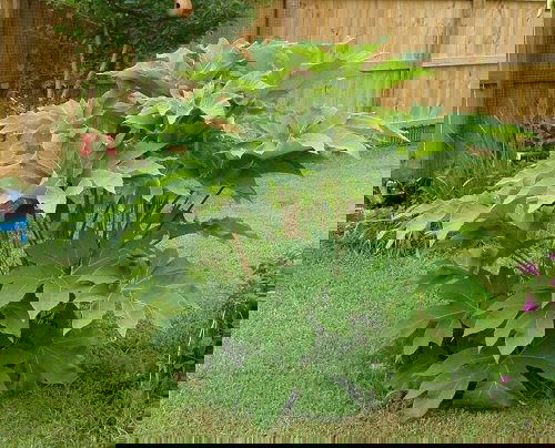 This big leaf perennial has hairy, thick, veined leaves that grow up to 4-5 feet across on pink hairy stems. Plant it in full sun to partial shade using rich, moist soil on the edges of pond or stream or bog gardens.