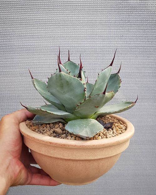 This stunning, easy to care agave showcases a rosette of fleshy and narrow, powder blue leaves with maroon tips.