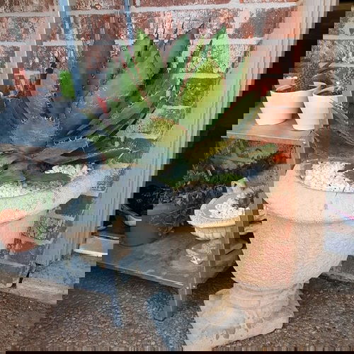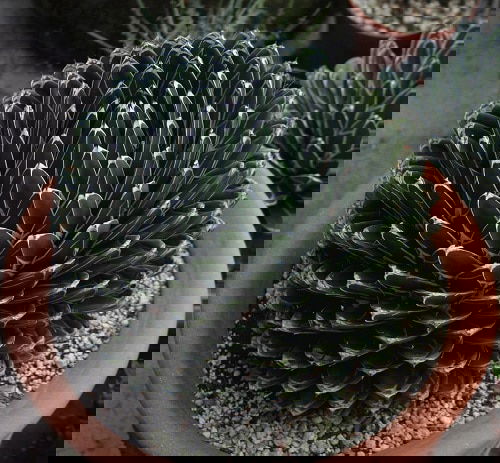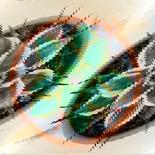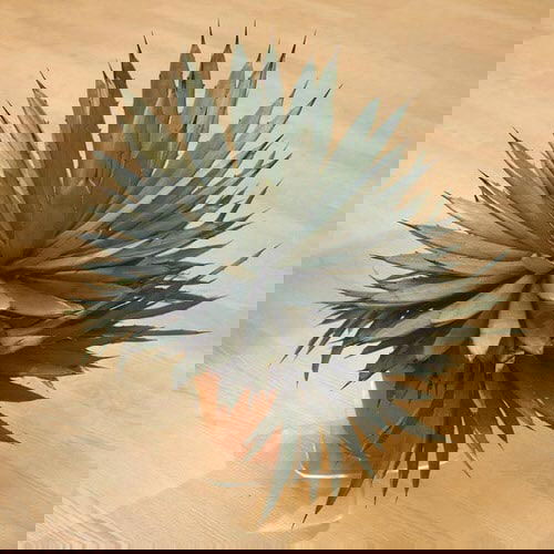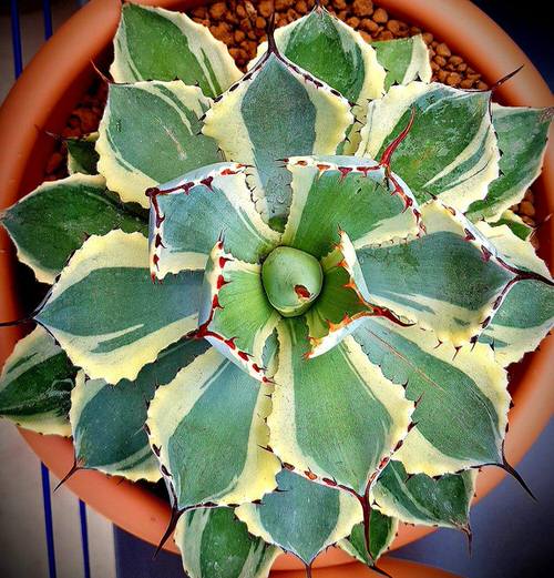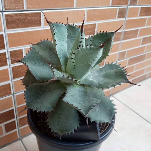 It forms a small symmetrical rosette of blue-green leaves, ruffled sharp edges with sharp maroon tip and spines.