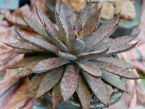 This compact succulent features a rosette of wide gray-green leaves with maroon spots and fine-toothed edges.