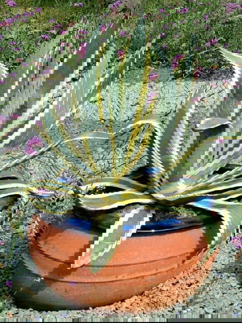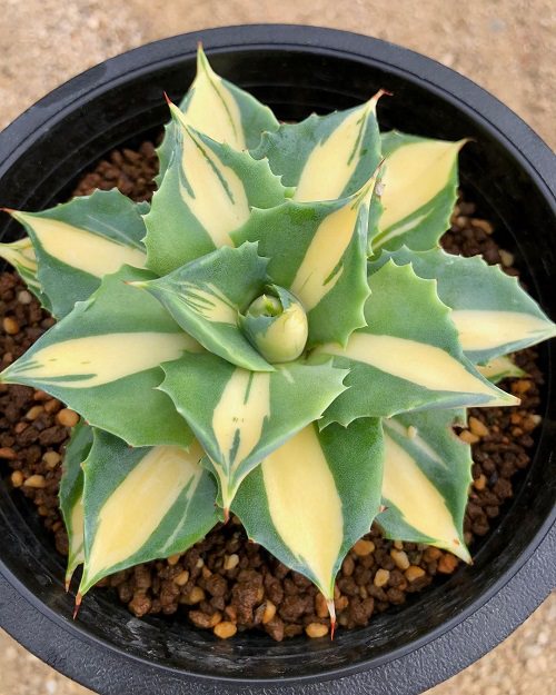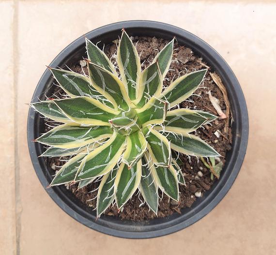 This pretty variegated agave forms a single rosette of mid-green central stripe, wide creamy yellow edges with papery maroon-black spines.