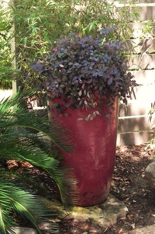 The dark maroon-red foliage of Chinese fringe flower looks awesome in light-colored tall planters. Add multiple containers on a walkway to add a solid appeal to your garden.