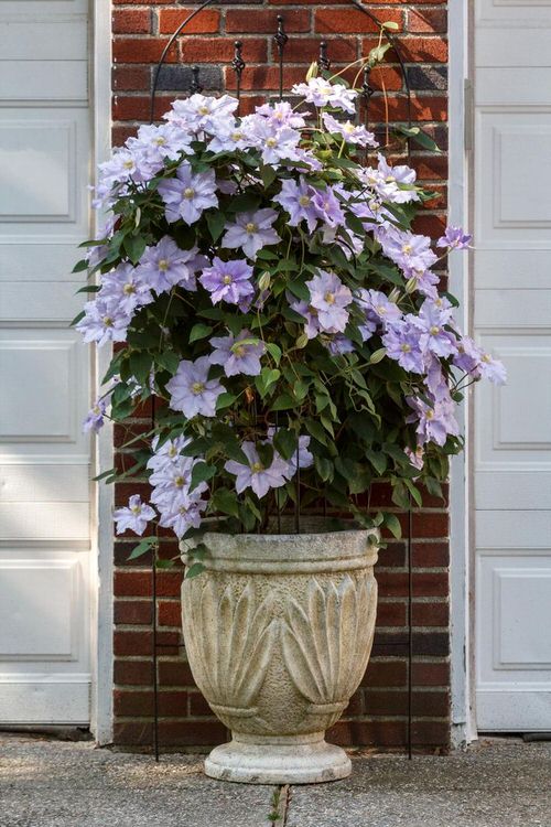 One large planter and clematis are all you need on a patio for stunning decor. Betty Corning, Black Prince, and Pink Champagne are best for containers!