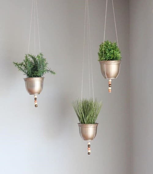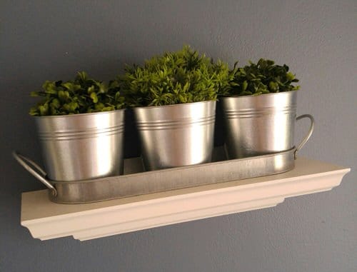Get pots from a dollar store, paint them in a shade of silver and hang them to showcase your favorite plants or even faux ones! Click here for details.