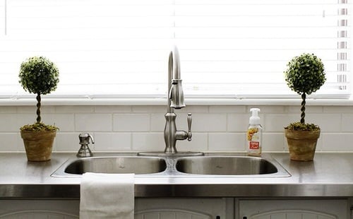 The topiary balls at the dollar store with a set of three metal pails can work as great planters for the kitchen. Details are here.
